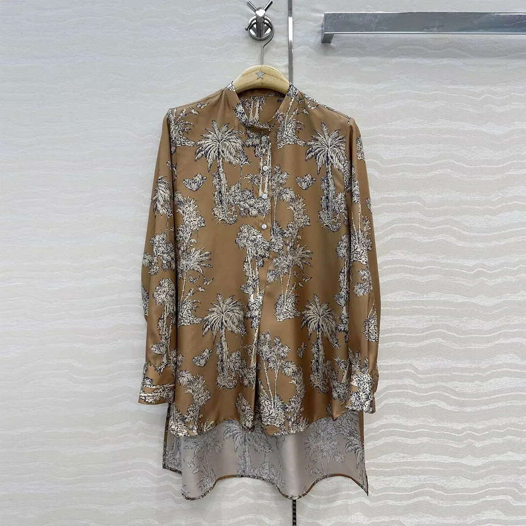 2025 New Autumn Vintage Coconut Tree Print Butterfly 100% Silk Long Shirt Women O-neck Long Sleeve Loose Casual Blouse Tops
