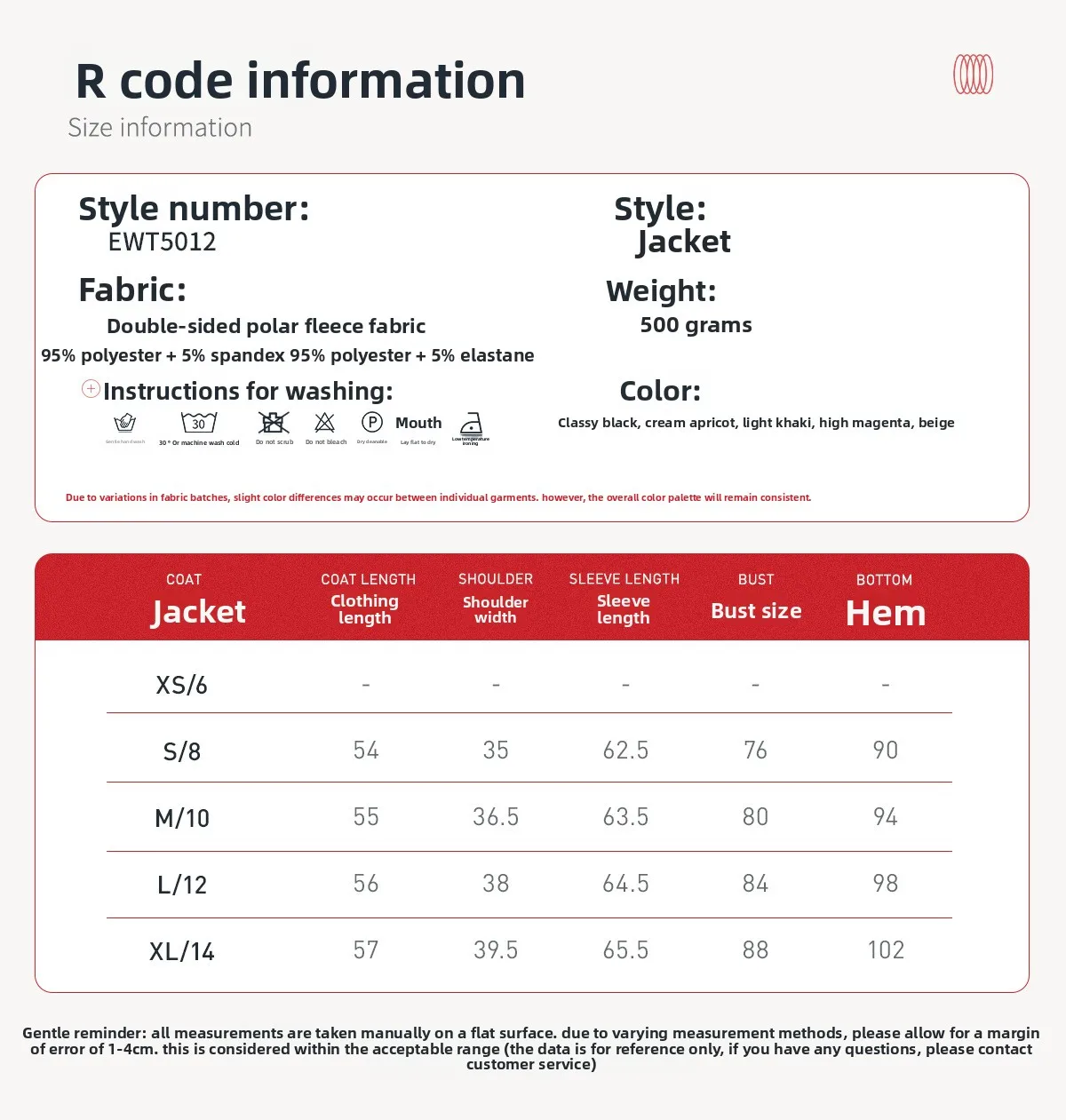 En raison des variations dans les lots de tissus, de légères différences de couleur peuvent survenir entre les vêtements individuels. Cependant, la palette de couleurs globale restera cohérente.
