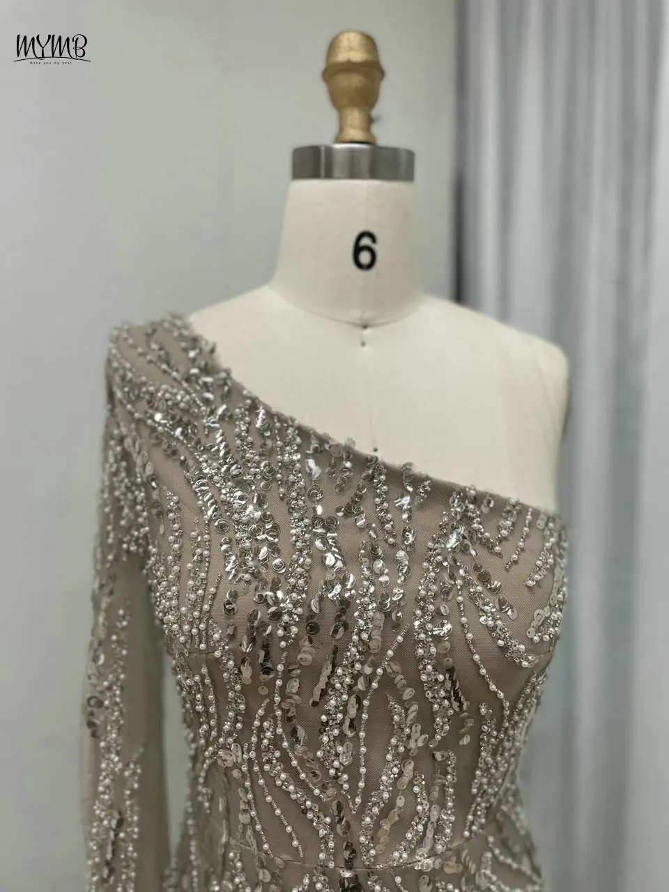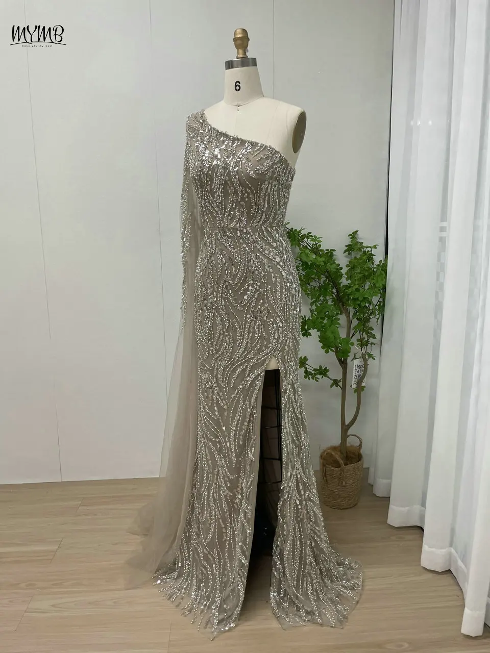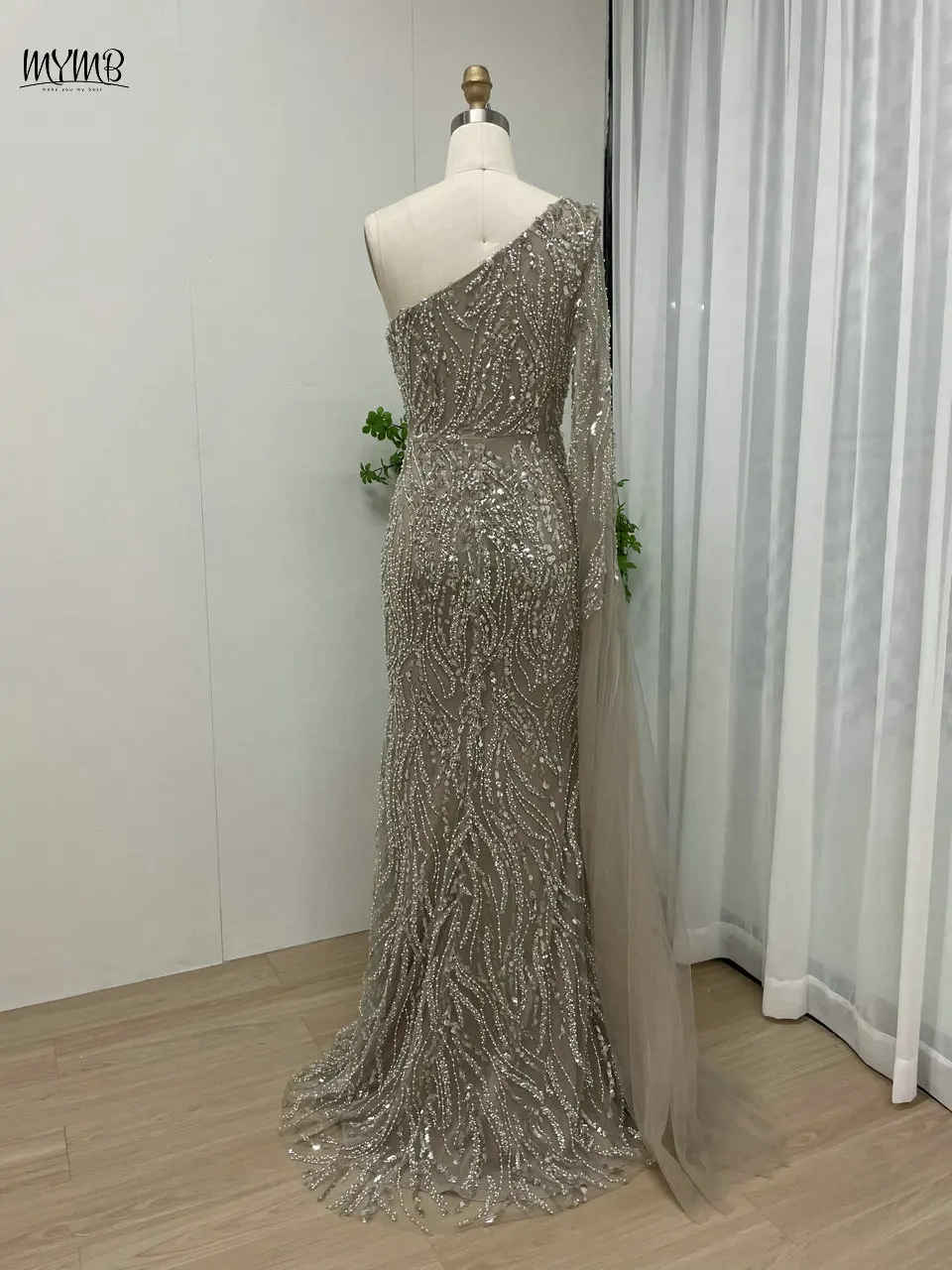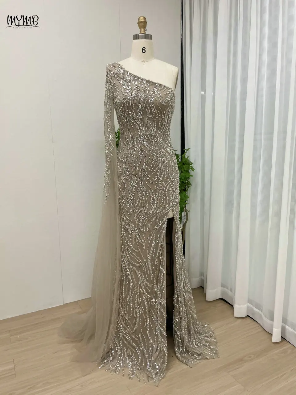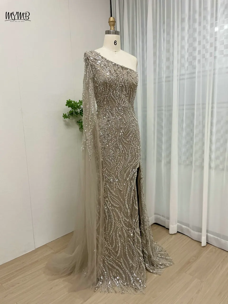 MYMB Champagne Amazing Beaded One Shoulder Mermaid Formal Occasion Dresses Sexy Cape Sleeve Evening Gowns with Side Split Y30023