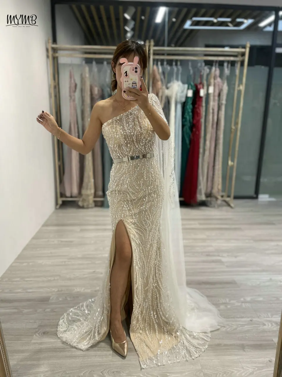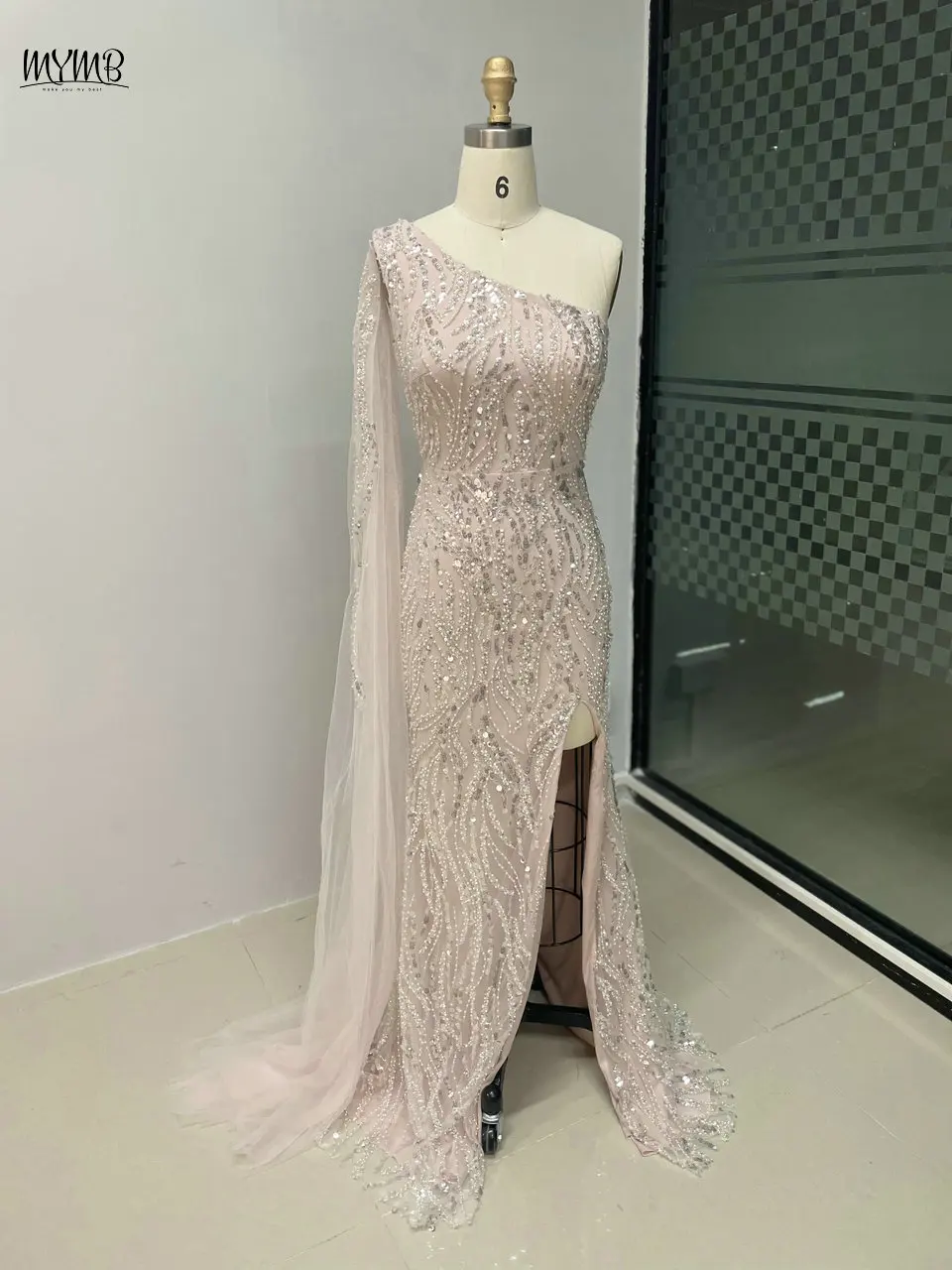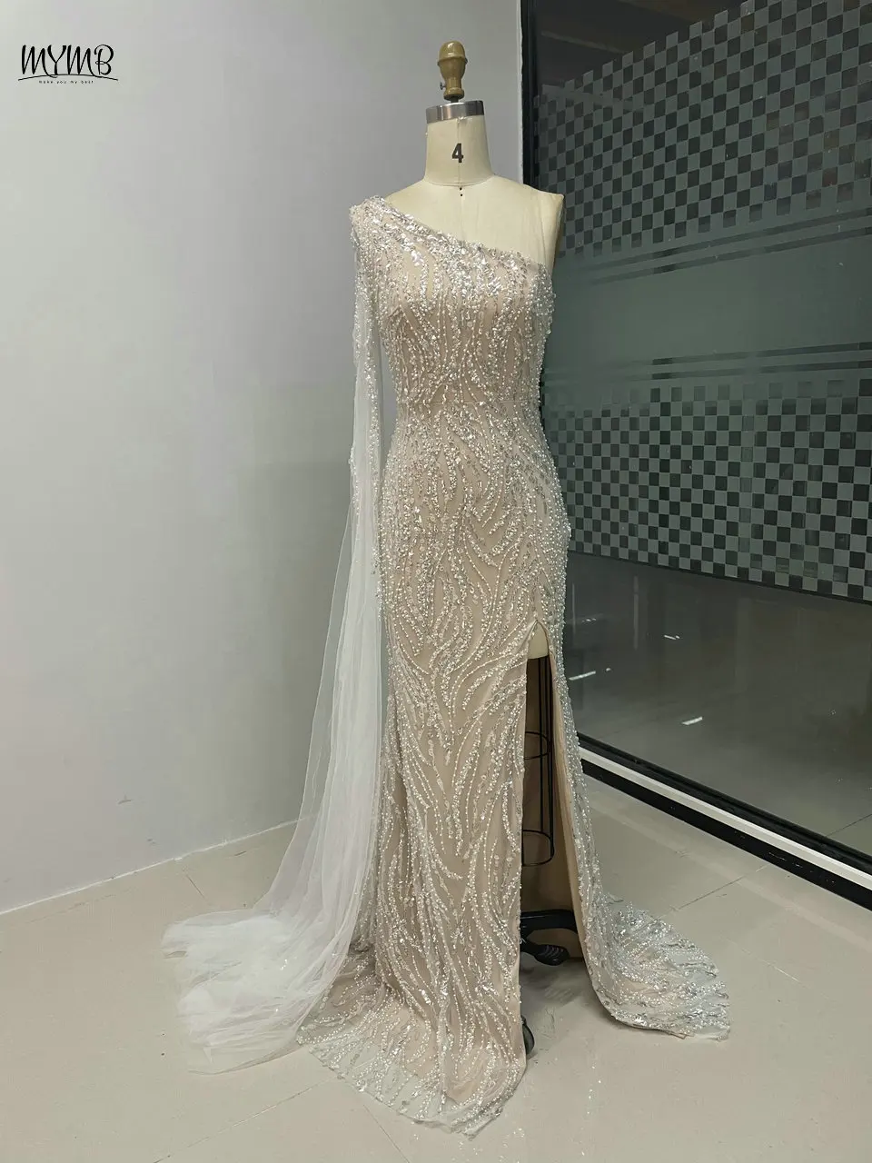 MYMB Champagne Amazing Beaded One Shoulder Mermaid Formal Occasion Dresses 2025 Sexy Cape Sleeve Evening Gowns with Side Split