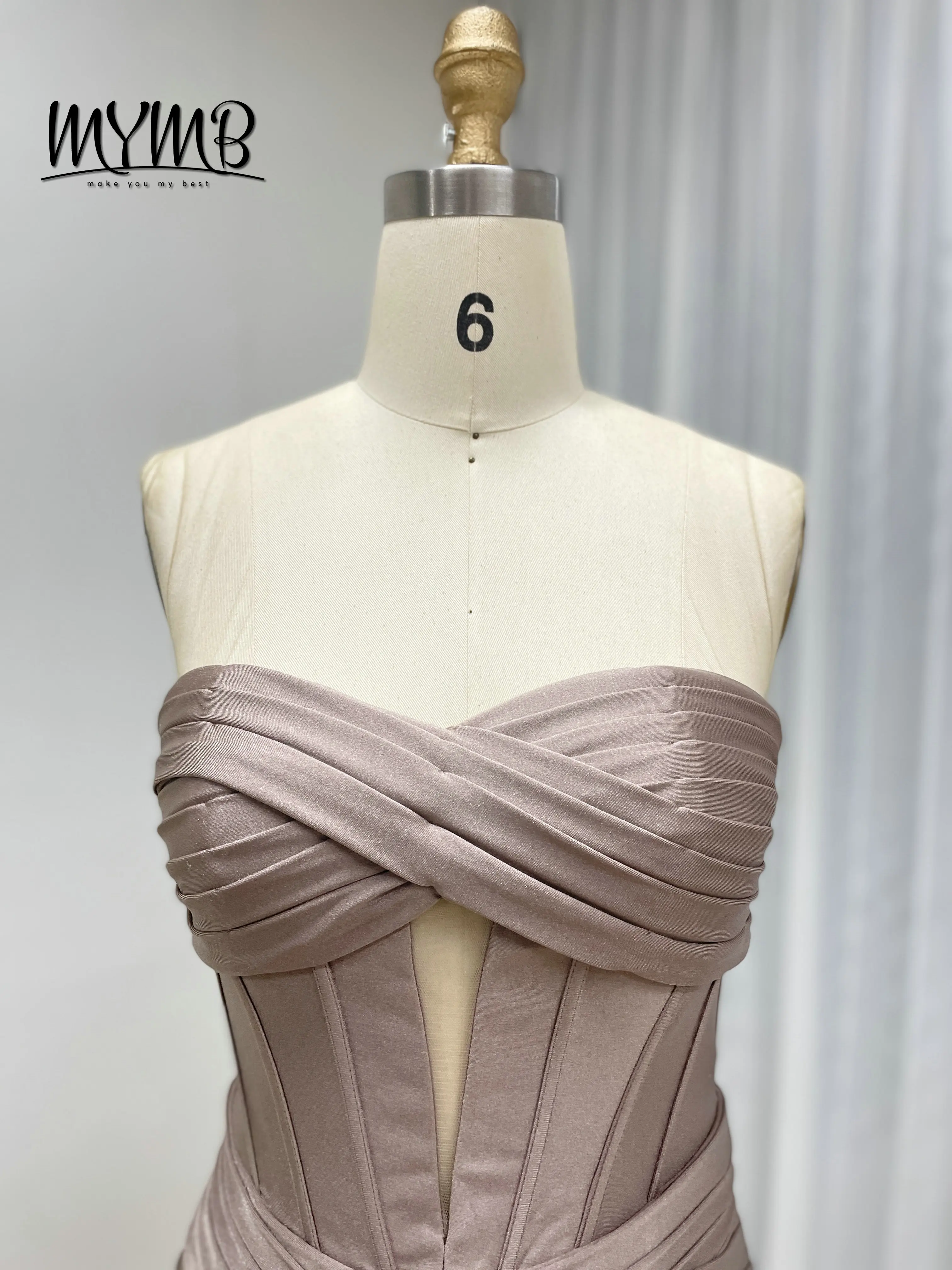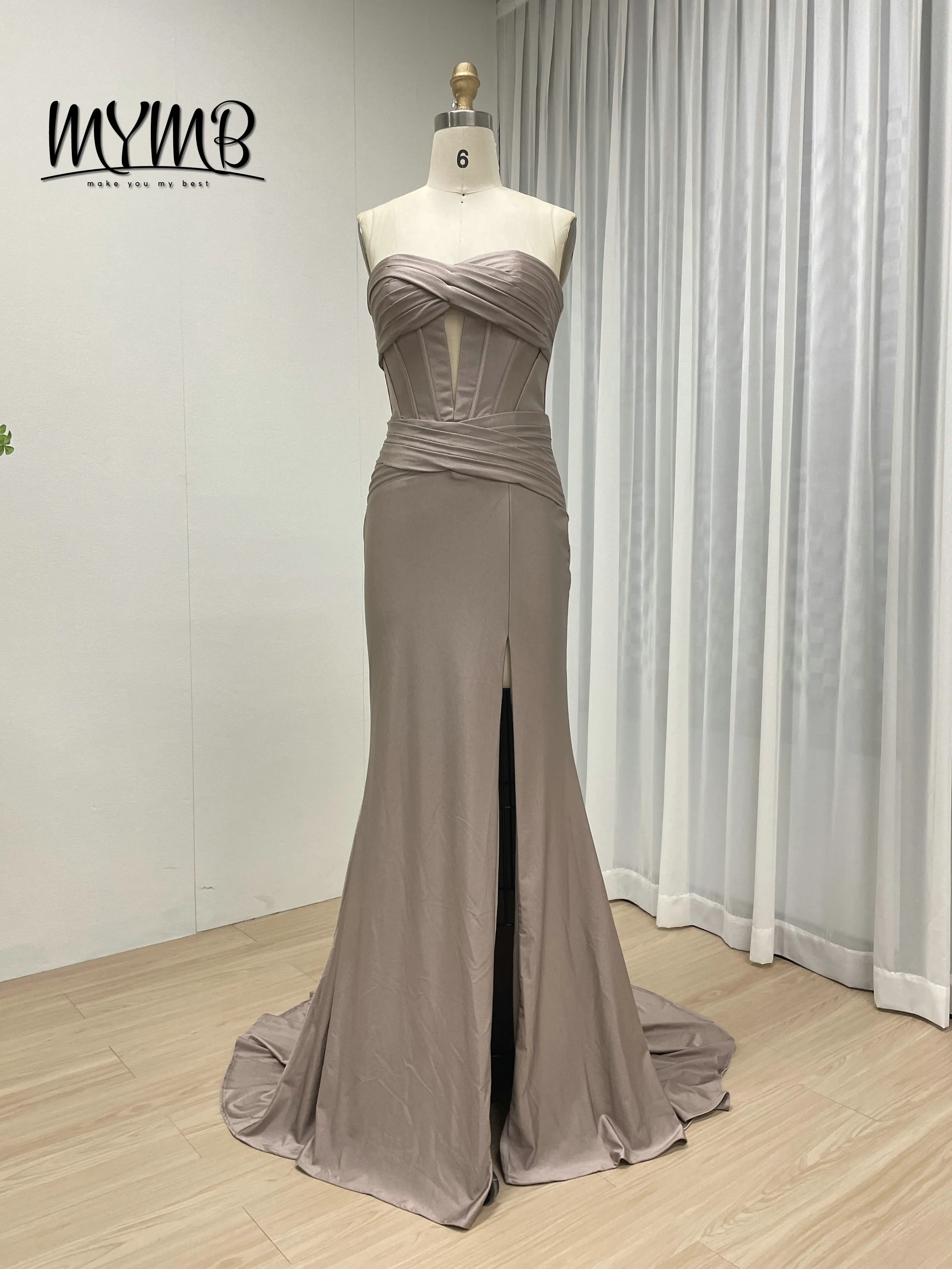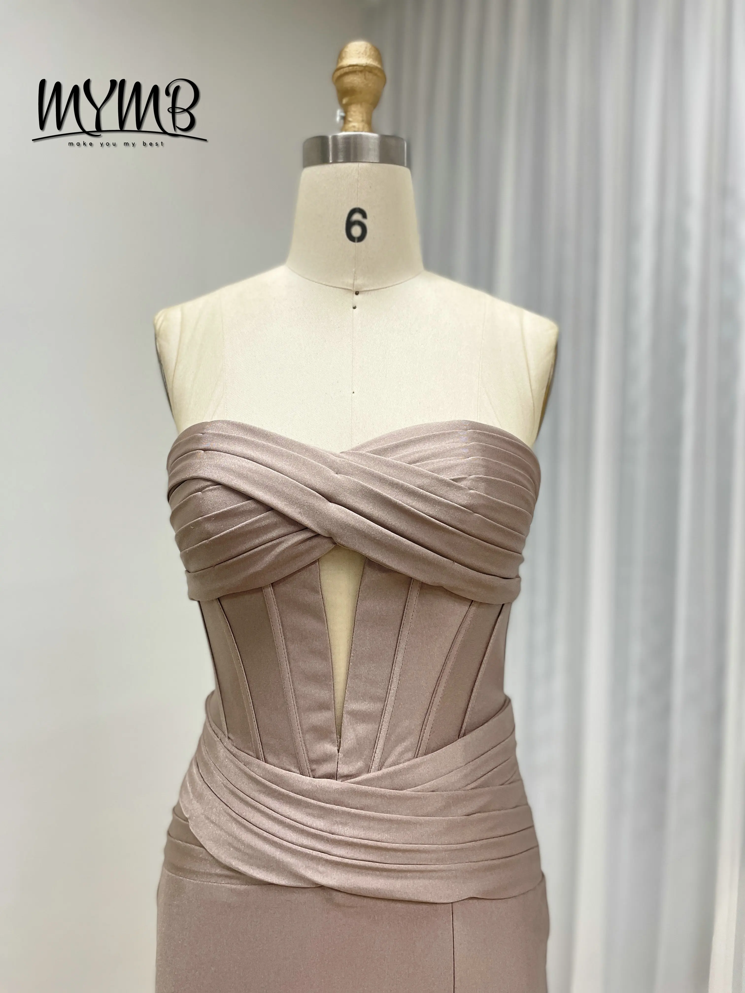 MYMB Gorgeous Caramel Strapless Evening Gown with Chic Ruched Details High Slit Flattering Fit Ideal for Prom Weddings MC20074