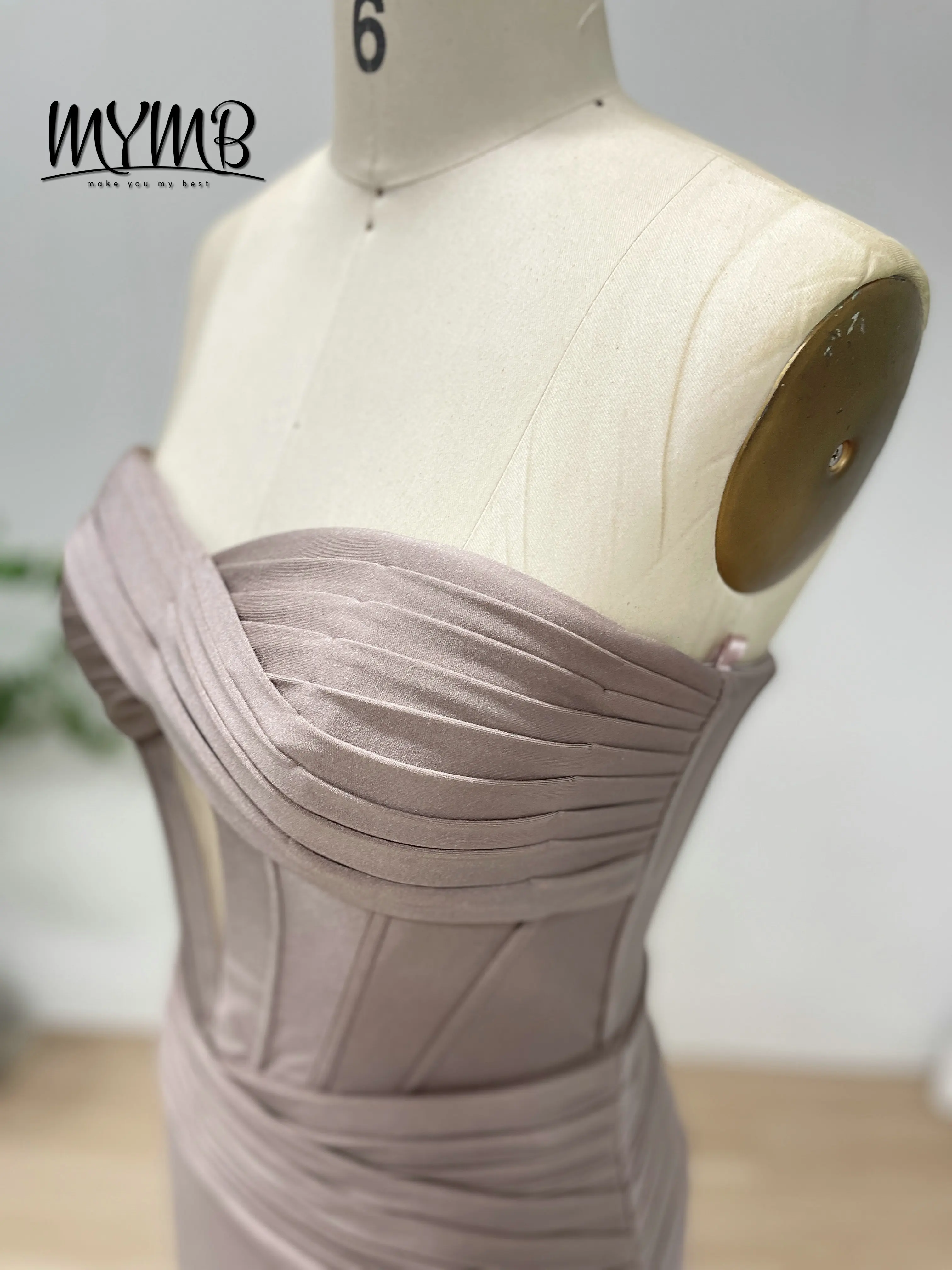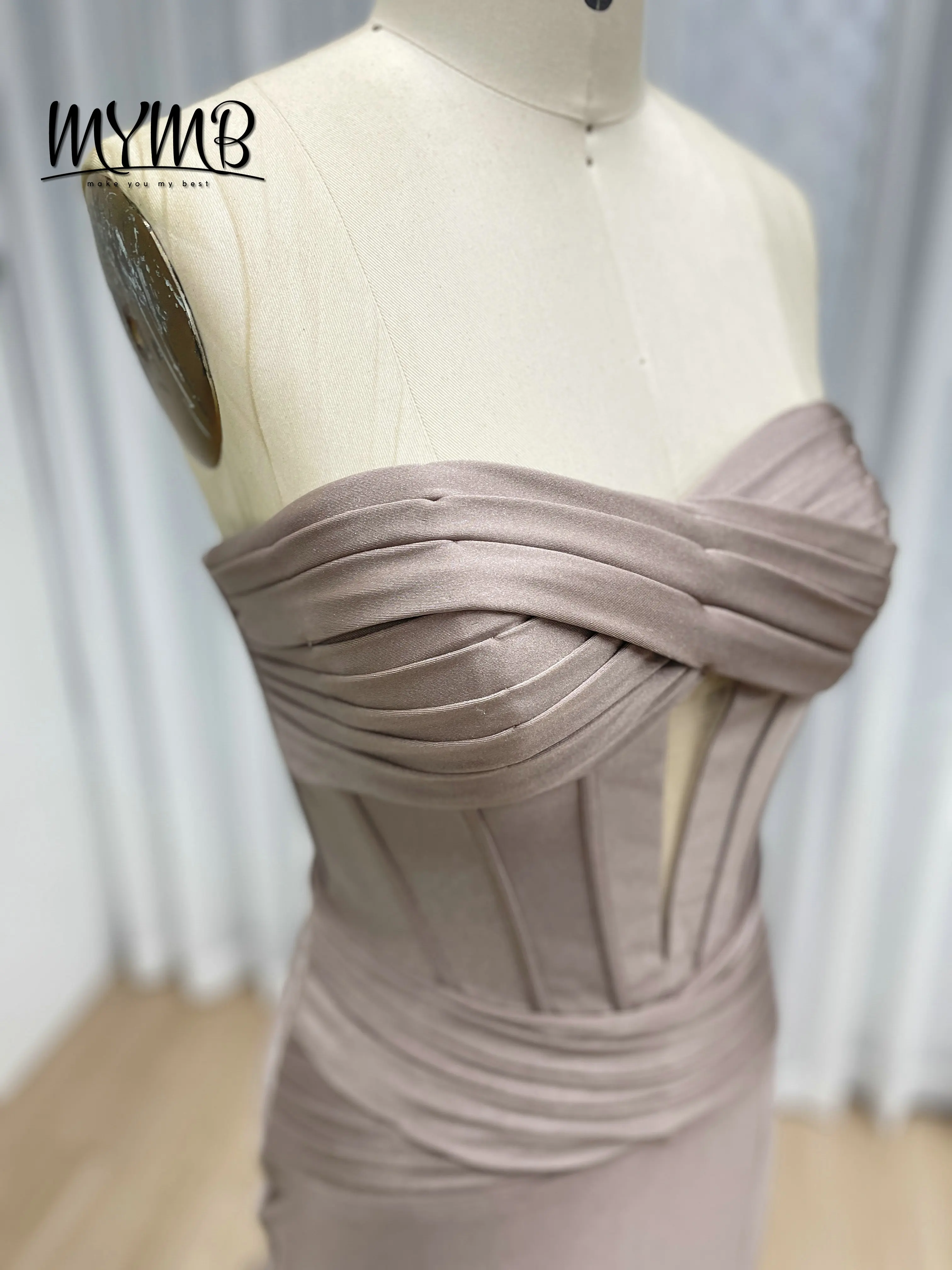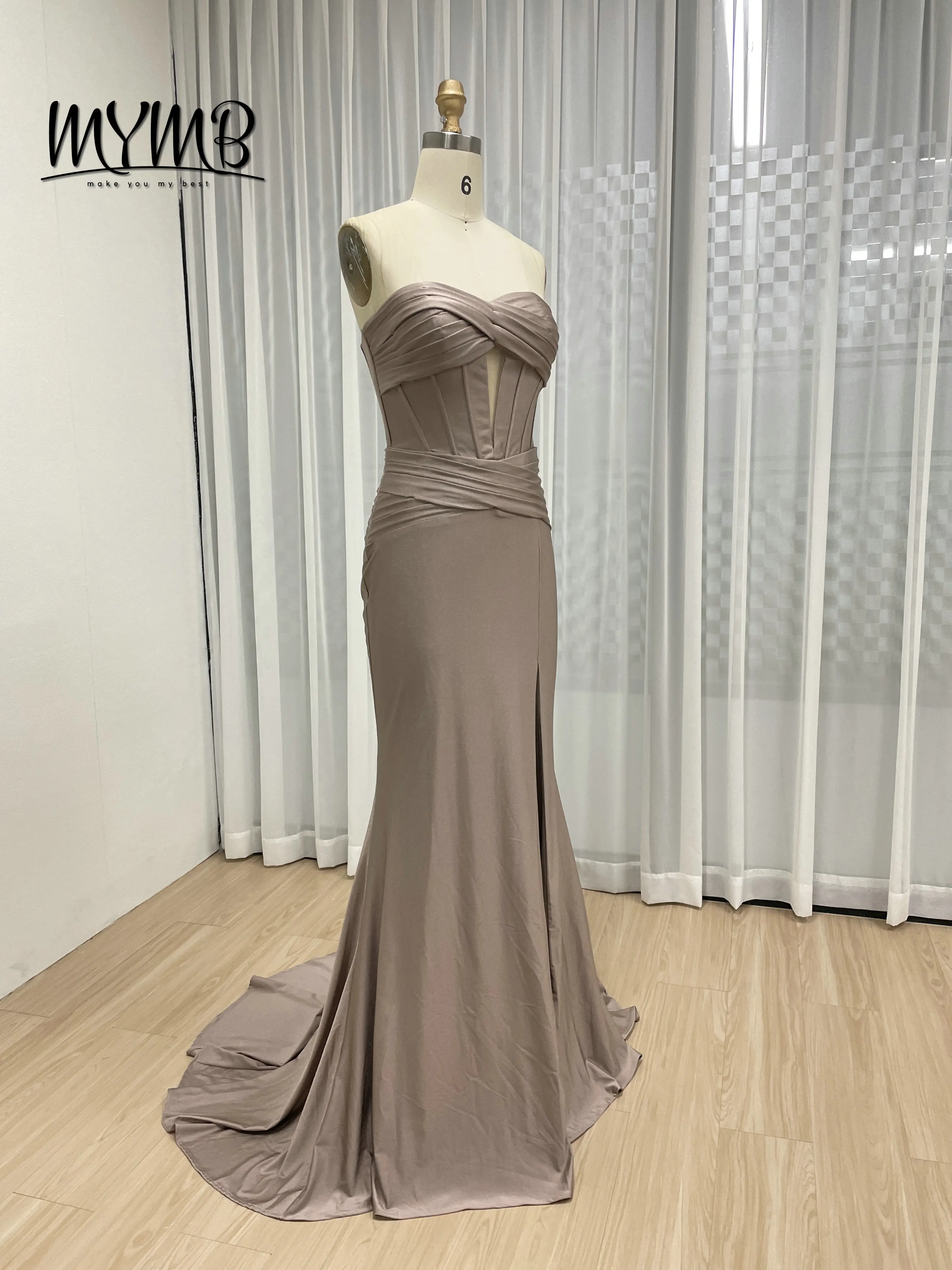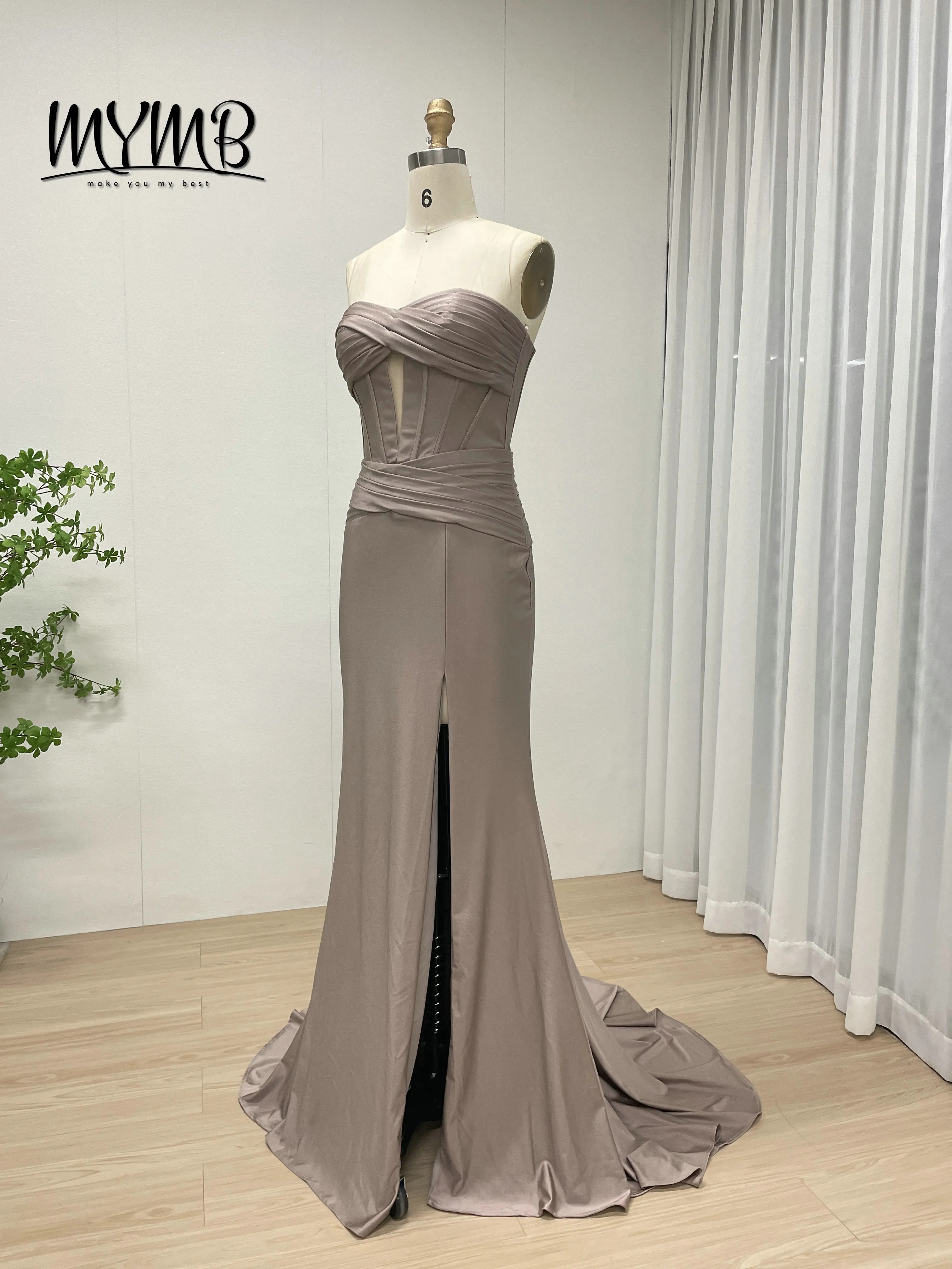 MYMB Gorgeous Caramel Strapless Evening Gown with Chic Ruched Details High Slit Flattering Fit Ideal for Prom Weddings MC20074