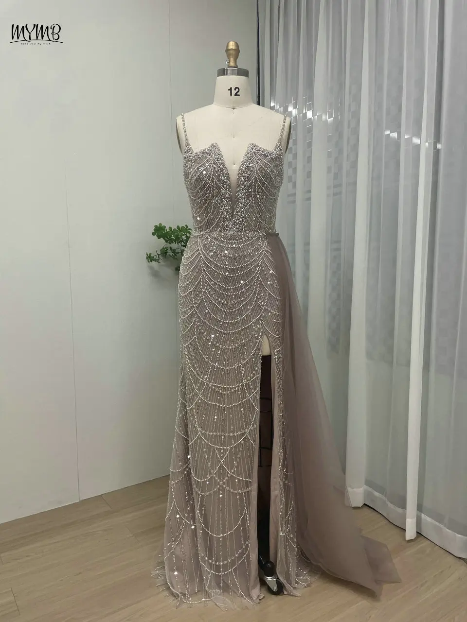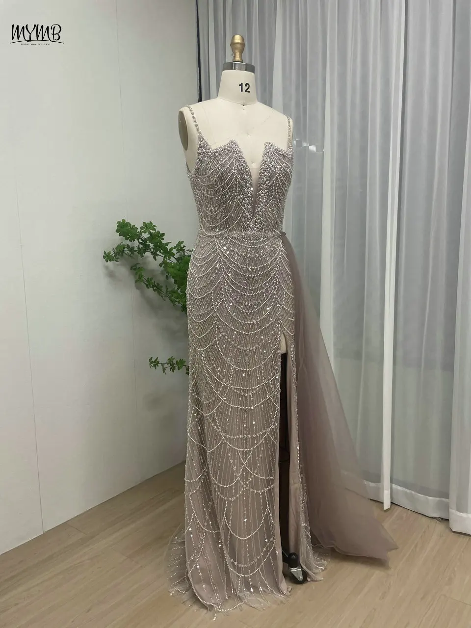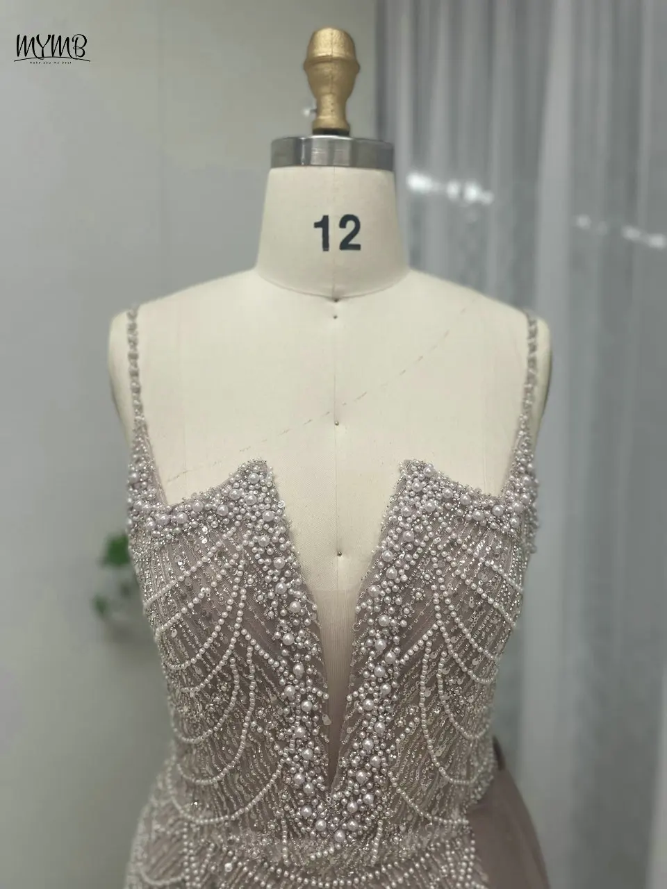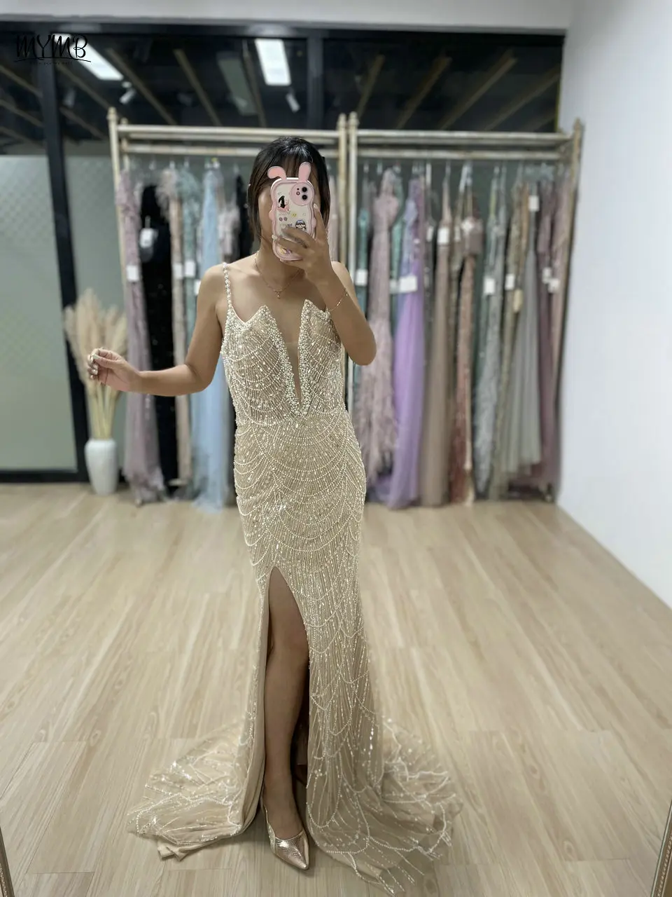 MYMB Pink Stunning Spaghetti Strap Side Split Evening Gowns for Women Party New Arrival Trendy Mermaid Tulle Beaded Evening Gown