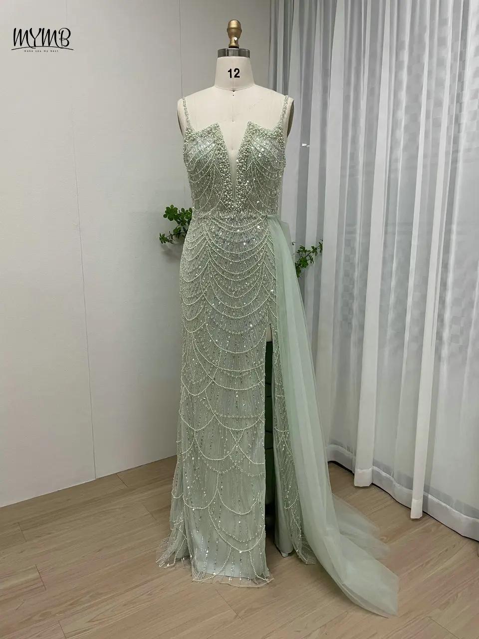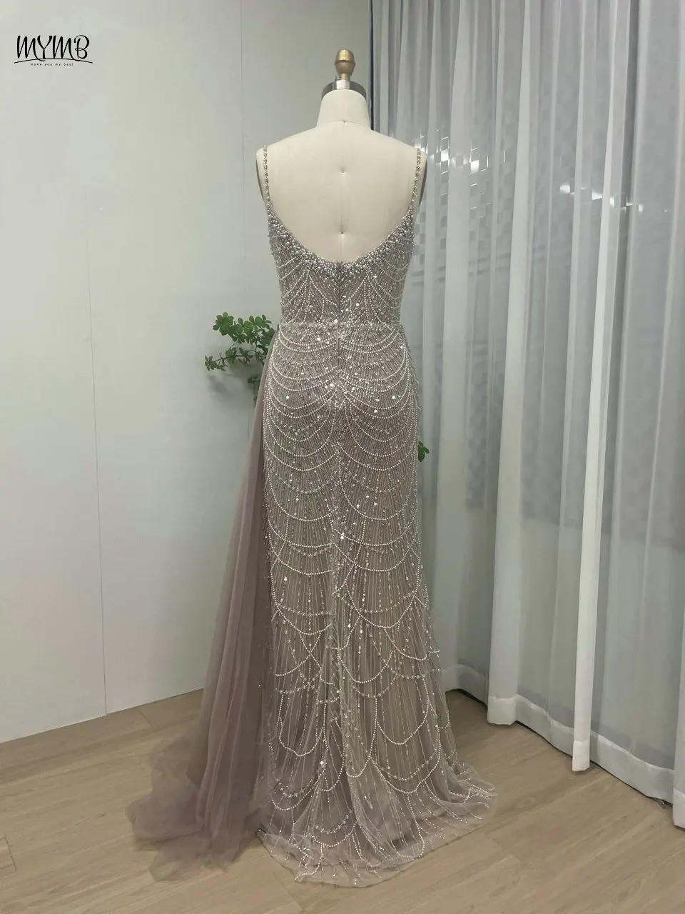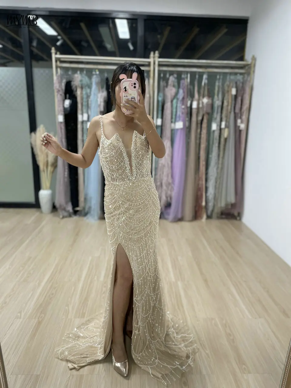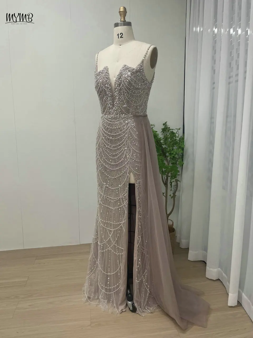 MYMB Pink Stunning Spaghetti Strap Side Split Evening Gowns for Women Party New Arrival Trendy Mermaid Tulle Beaded Evening Gown