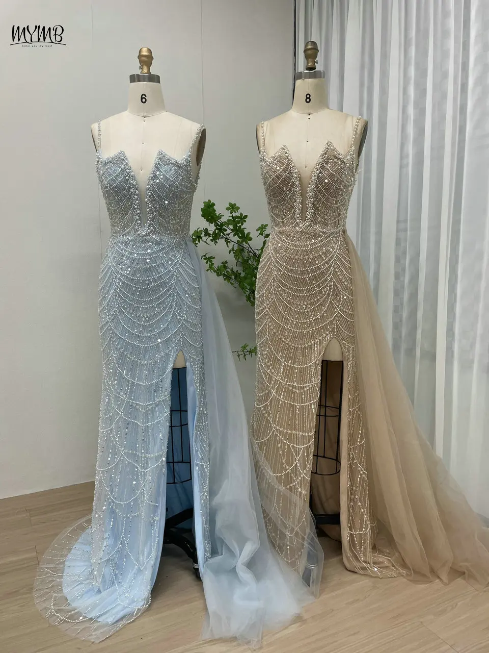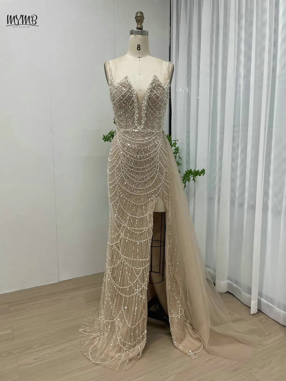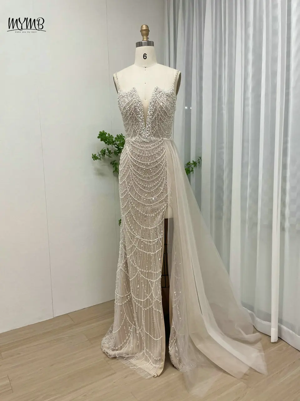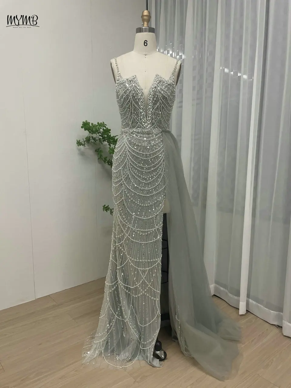 MYMB Pink Stunning Spaghetti Strap Side Split Evening Gowns for Women Party New Arrival Trendy Mermaid Tulle Beaded Evening Gown
