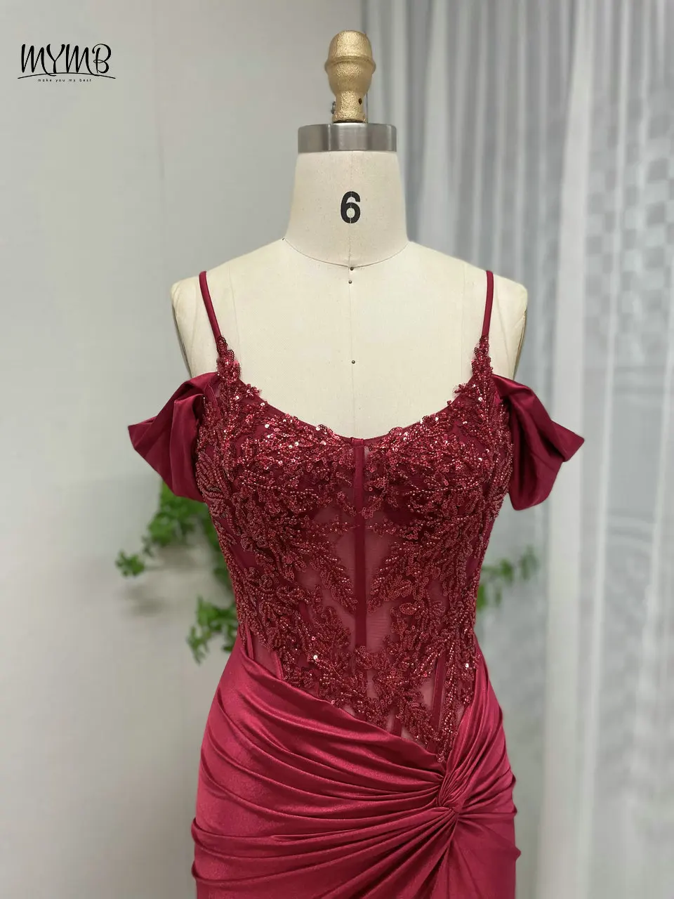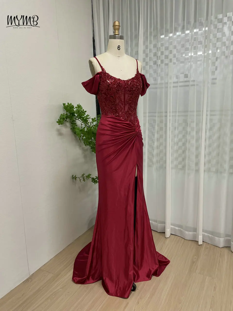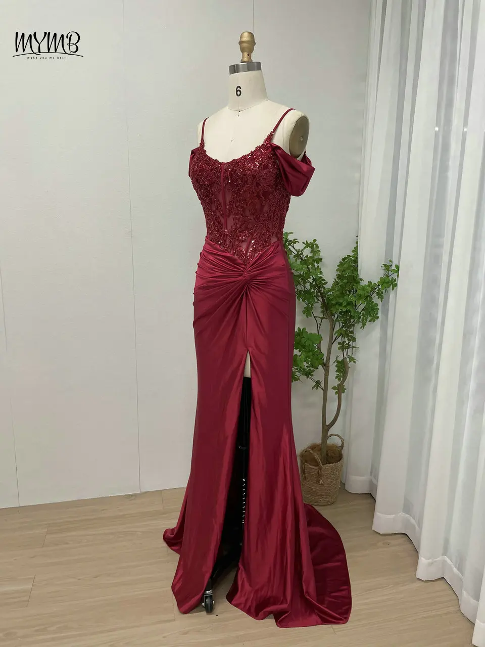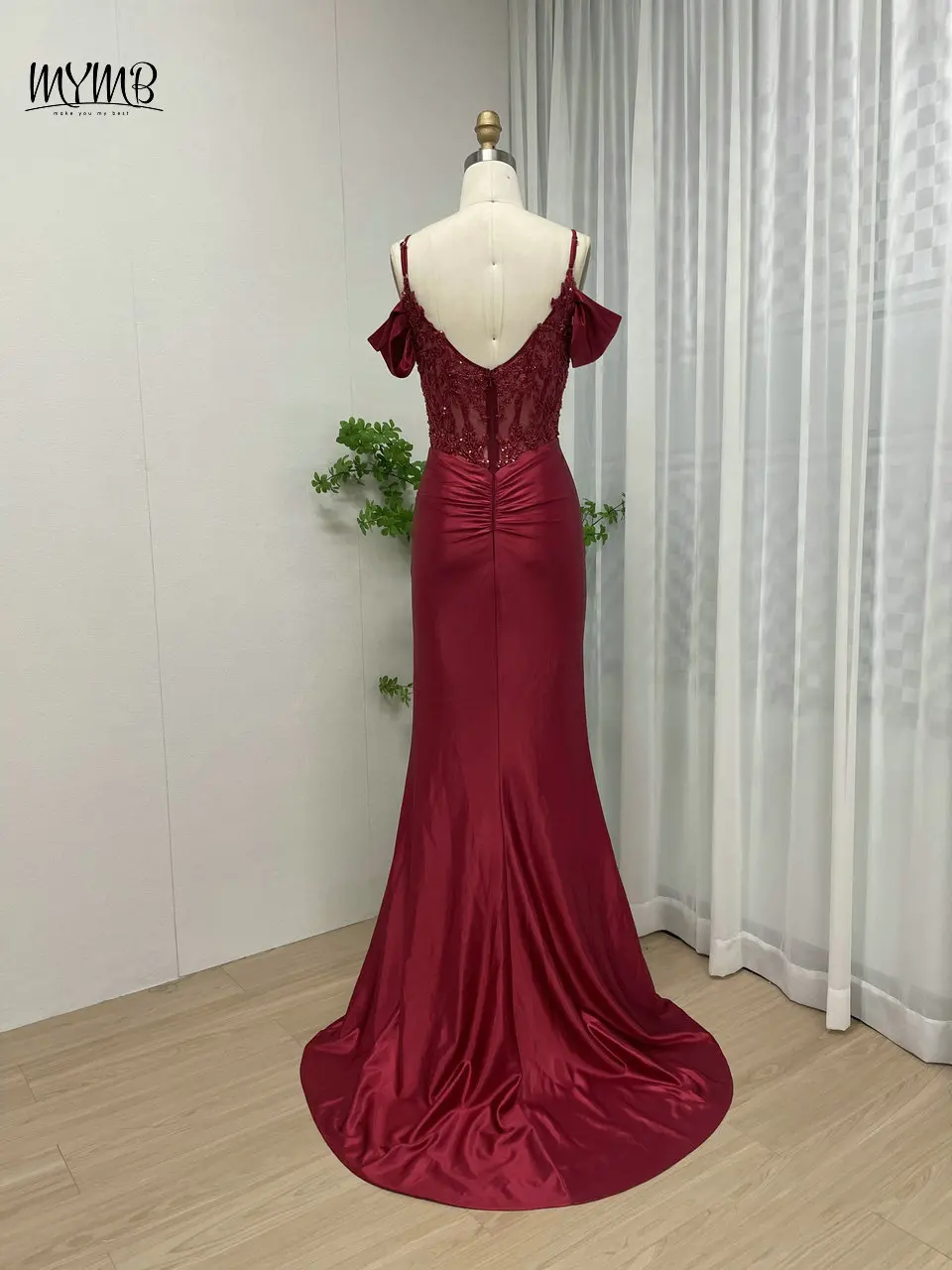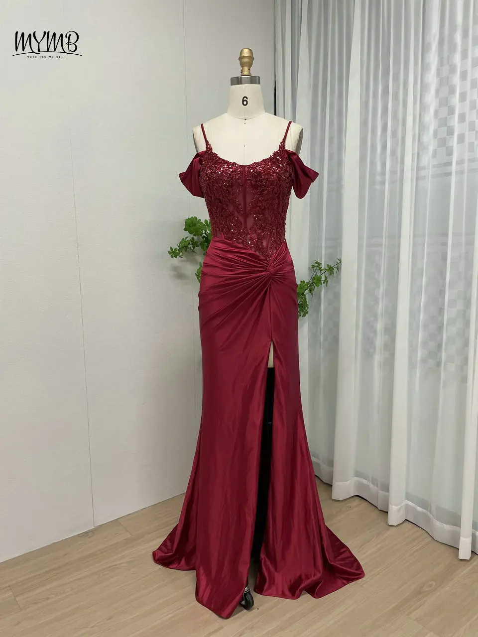 MYMB Wine Spaghetti Straps Women Sheath Bridesmaid Dresses Classic Off Shoulder High Slit Beaded Evening Gown vestidos de gala