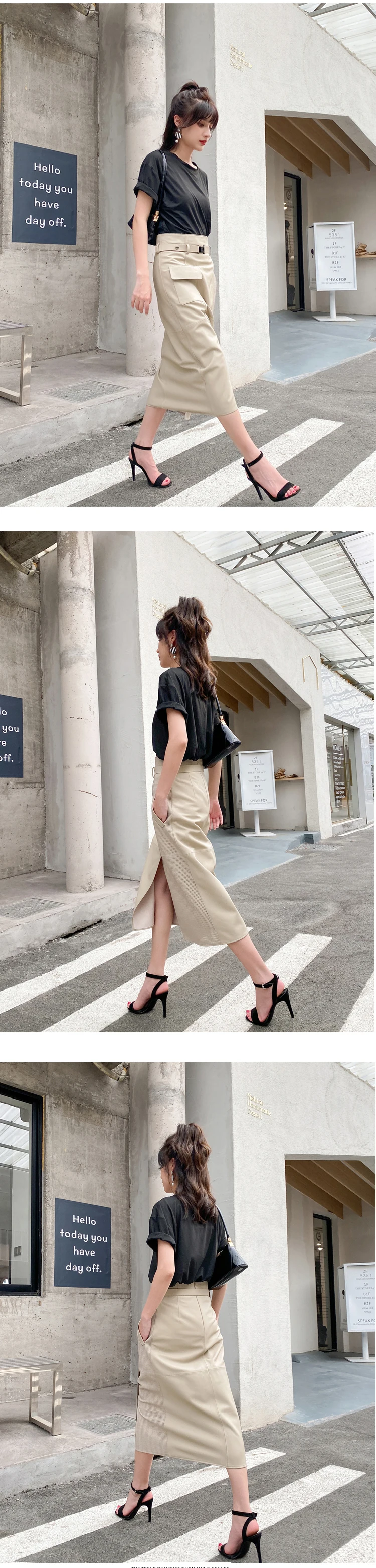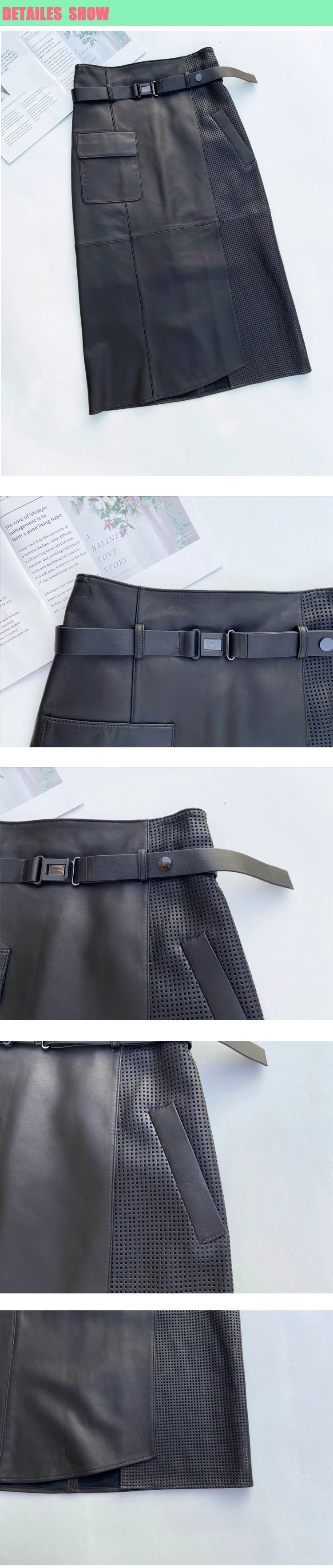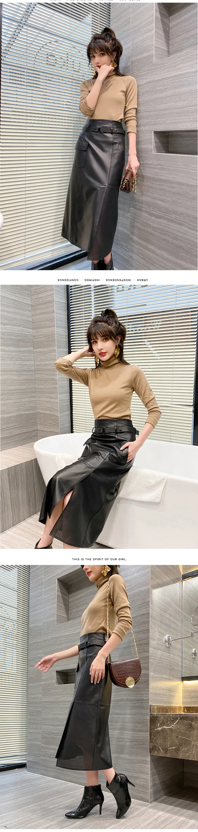 Women Clothes 2025 Spring Genuine Leather Falda Midi Mujer Sheepskin Beige High Waist A-line Maxi Skirt Front Slit Korean Style