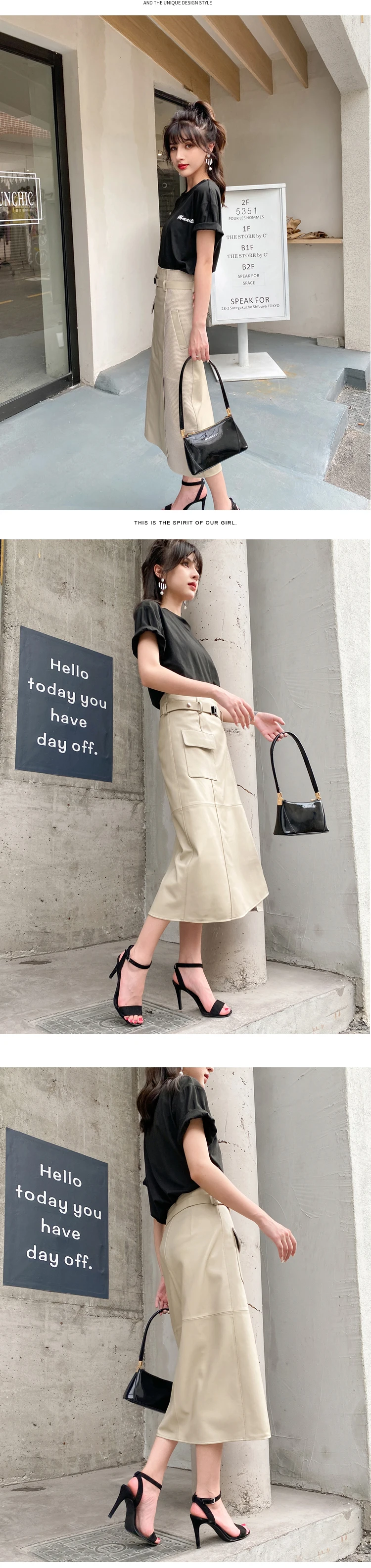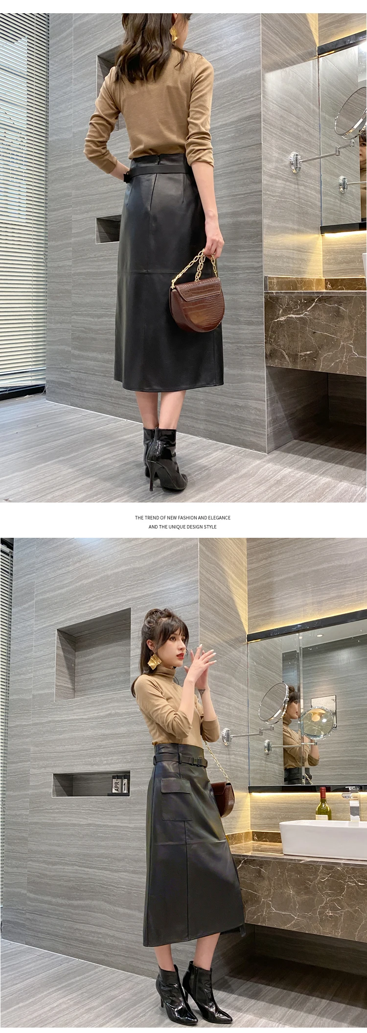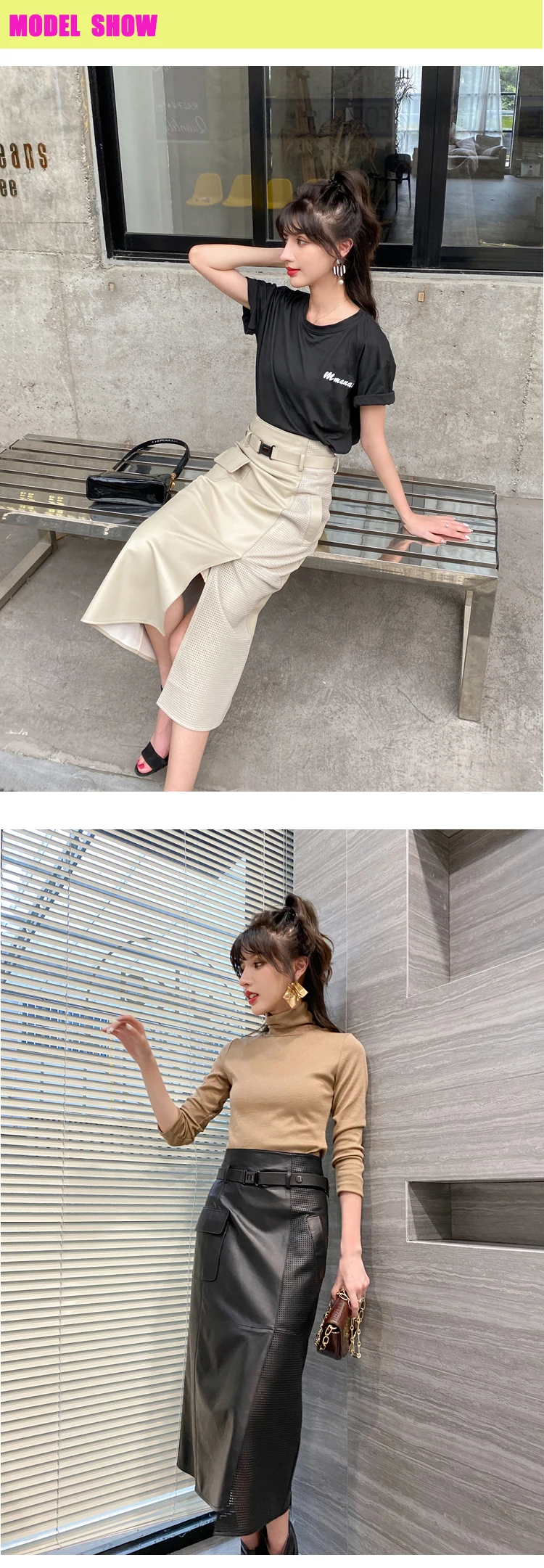 Women Clothes 2025 Spring Genuine Leather Falda Midi Mujer Sheepskin Beige High Waist A-line Maxi Skirt Front Slit Korean Style
